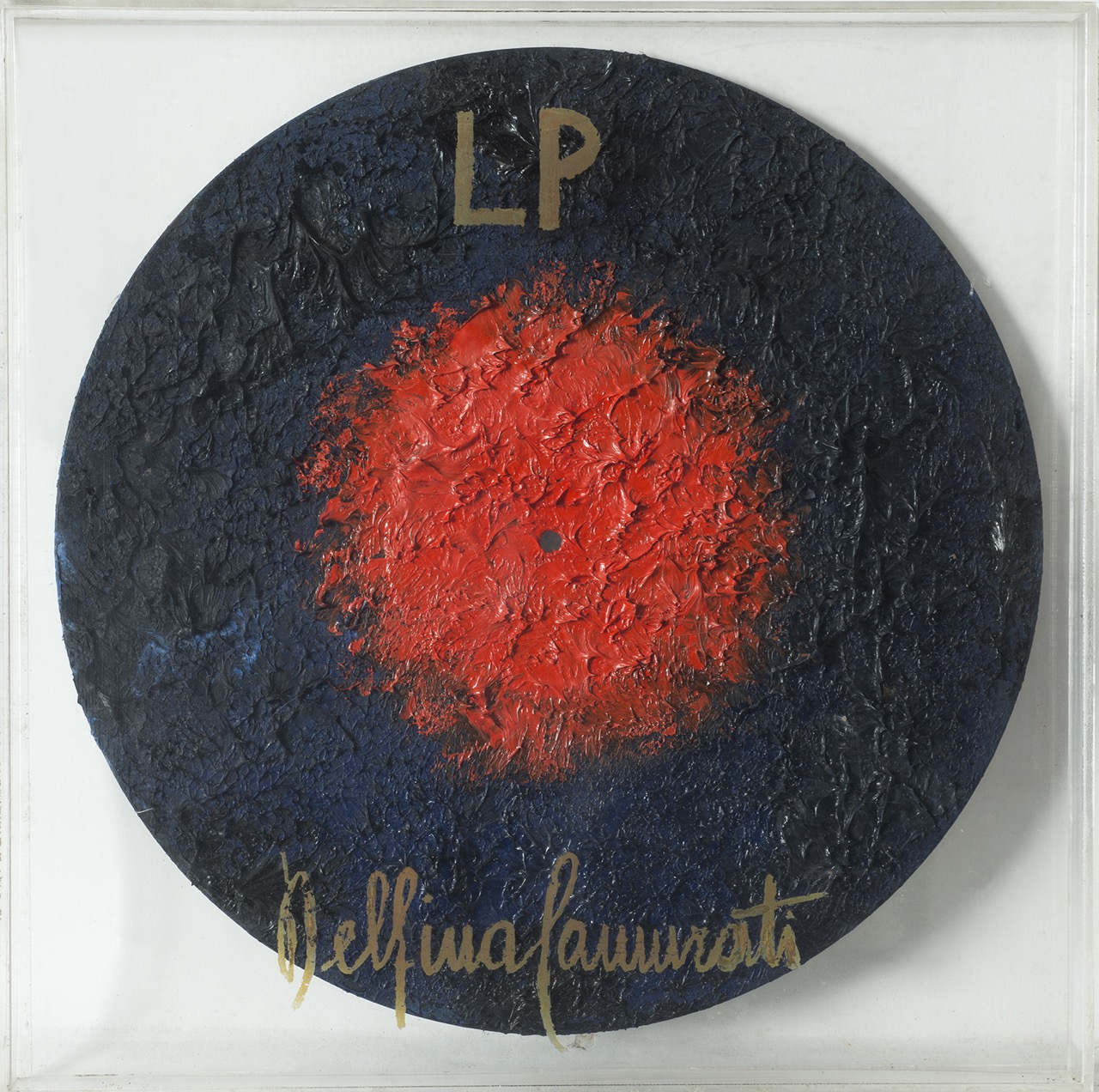 Delfina Camurati (1942) Senza titolo Firmato Delfina Camurati in basso al centro Olio su LP in teca di plexiglas cm 33x33x2,5 (teca) - cm 30 (diametro LP) Iscrizione sul retro 1/33