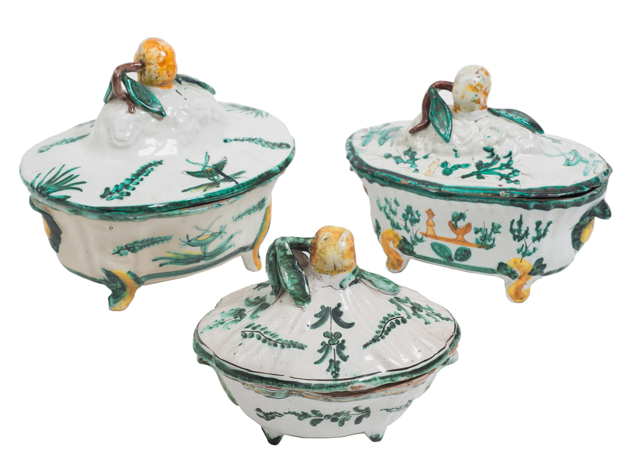 Set di 3 zuppiere in maiolica di Cerreto Sannita, con coperchio finale con frutto e fogliame. dipinte nei colori tipici della maiolica di cerreto, verde ramina e giallo ocre zuppiera grande, h cm 30 x diam cm 29,5 zuppiera media, h cm 24 x diam cm 28 zuppiera piccola, h cm 22 x diam cm 23 coperchio della zuppiera grande e piccola non pertinenti fine XVIII-inizi XIX secolo