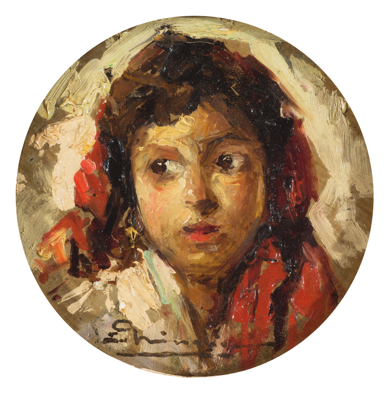 Ermogene Miraglia ( Napoli, 1907 - 1964 ) Fanciulla olio su cartoncino, di forma circolare, diam. cm 18 firmato E. Miraglia in basso al centro