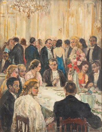 Vincenzo La Bella ( Napoli, 1872 - 1954 ) Convivio olio su tela, cm 65x52 firmato V. La Bella in basso a destra