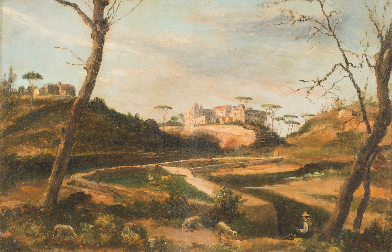 Scuola italiana, XIX secolo, nei modi di Anton Sminck van Pitloo ( Arnhem, 1860 - Napoli, 1837 ) Convento di Santa Maria dei Monti detto Oasi di Grottammare, Marche olio su tela, cm 29x44 reca firma A. Pitloo in basso a destra