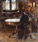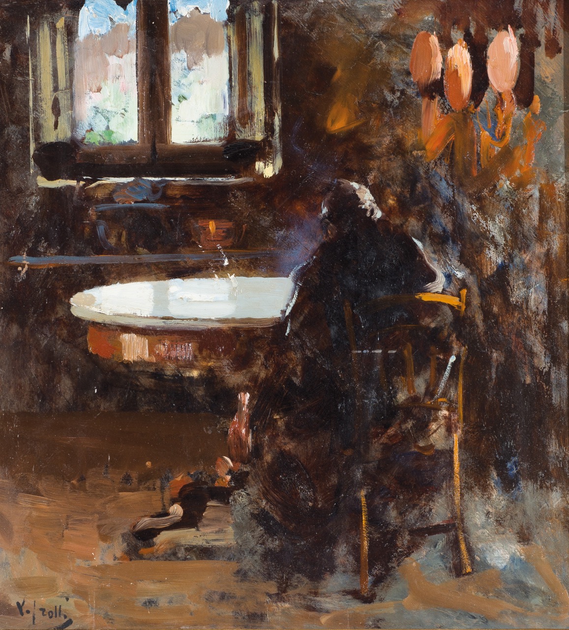 Vincenzo Irolli (Napoli,1860 -1949) Interno di casa olio su tavola, cm 38x35 firmato V. Irolli in basso a sinistra