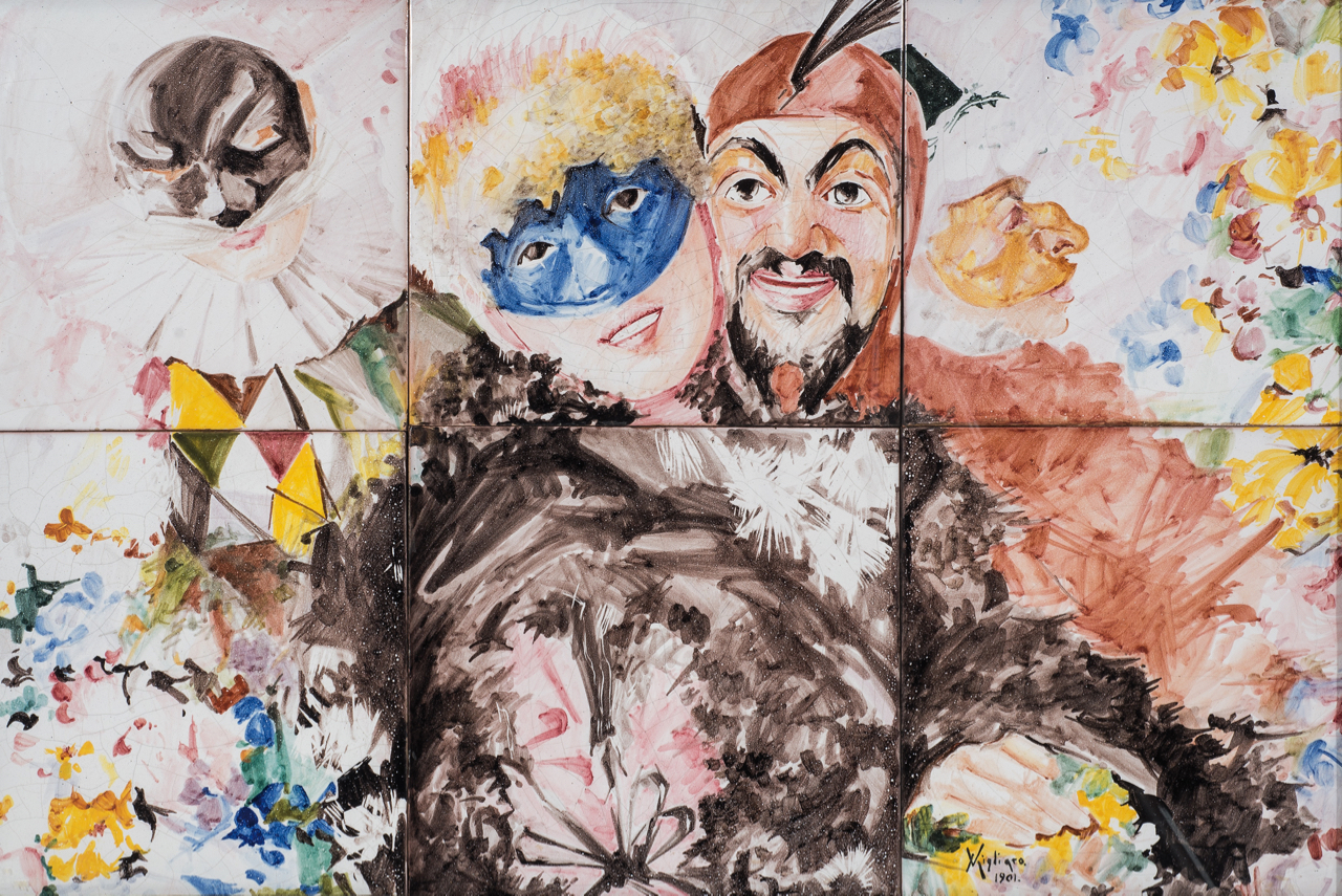 Vincenzo Migliaro (Napoli, 1858 -Napoli, 1938) Carnevale ceramica napoletana del XX secolo, cm 48x70 firmato Migliaro 1901 in basso a destra