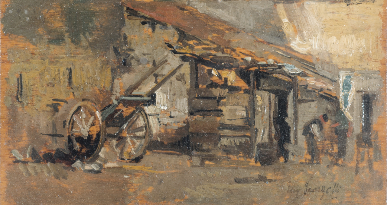 Eugenio Scorzelli ((Buenos Aires 1890 - Napoli 1958) Fattoria olio su tavola, cm 8x15 firmato Eugenio Scorzelli in basso a destra