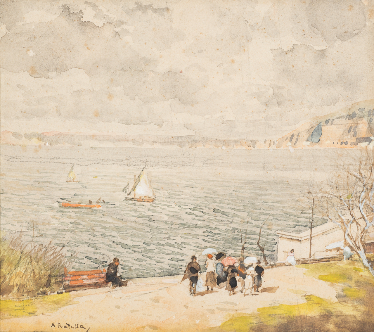 Attilio Pratella (Lugo di Romagna, 1856 - Napoli, 1949) Barche davanti la costa acquerello su carta, cm 19x21 firmato A. Pratella in basso a sinistra