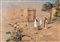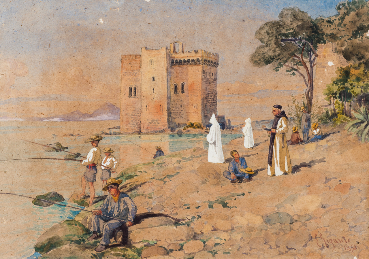 Ercole Gigante (Napoli, 1815 - 1860) Pescatori in riva al mare con un castelletto sullo sfondo acquerello su carta, cm 25x35 firmato E. Gigante 1852 in basso a destra