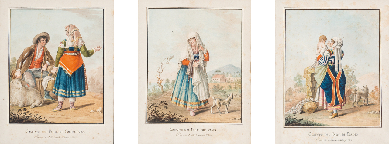 Luigi Del Giudice (attivo a Napoli, nella prima metà del XIX secolo) tre acquerelli su carta entro cornice unica, cm 33x27 cad. a)Costume del paese di Collelungo b)Costume del paese di Vasto c)Costume del paese di Fraino