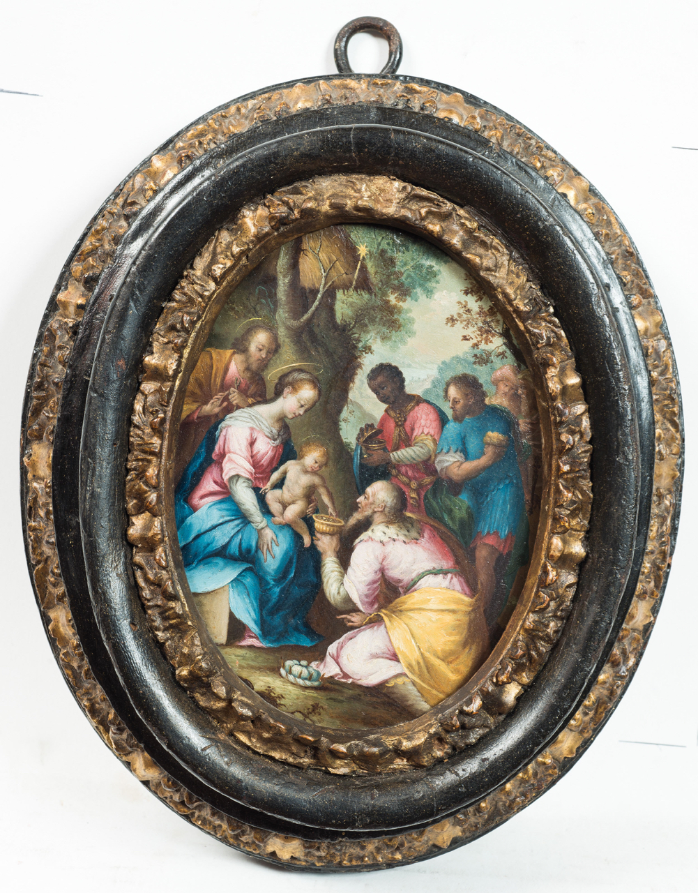Pittore nordico attivo nell' Italia centrale nella seconda metà del (Borgo San Sepolcro, 1536 -Firenze, 1603) Adorazione dei magi olio su tavola in ovale, cm 15x10 entro cornice a tre ordini di intagli di manifattura napoletana