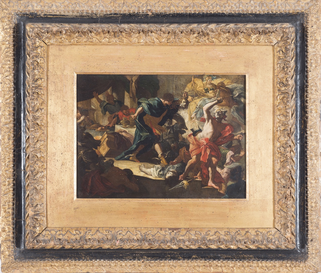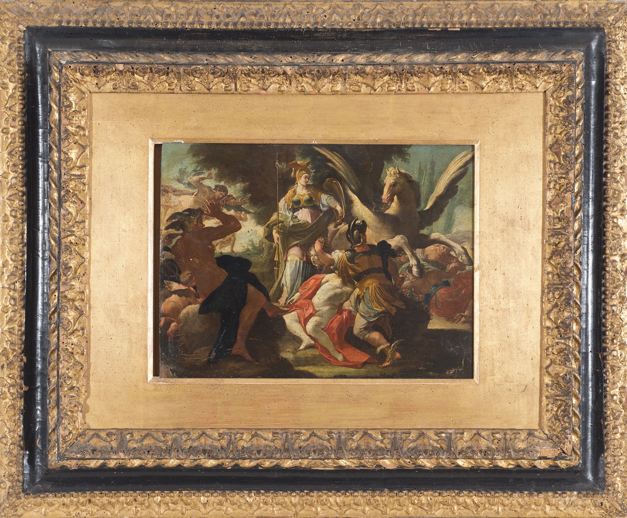 Domenico Antonio Vaccaro (Napoli, 1678 - Napoli, 1745) a)Perseo uccide Fineo b)Perseo uccide la Medusa coppia di oli su rame, cm 24x32 cad. entro importanti cornici coeve a tre ordini di intaglio Provenienza: Napoli, già collezione Laliccia Napoli, collezione Carrelli per discendenza Napoli,antiquario Franco Piedimonte fino al 1968 quando furono acquistati dagli attuali foto proprietario Bibliografia: N. Spinosa, La pittura napoletana da Carlo a Ferdinando IV di Borbone, in Storia di Napoli, vol. VIII, Cava de’ Tirreni, 1971, fig. a p. 455. N. Spinosa, Pittura napoletana del Settecento dal Barocco al Rococò, Napoli, 1986, p. 147, n. 194, tavv. 35-36 (con bibliografia precedente). N. Spinosa, in Settecento napoletano. Sulle ali dell'aquila imperiale 1707- 1734, catalogo della mostra, Napoli, 1994, nn. 208a-208b, pp. 410-411, ill. a col. N. Spinosa, Pittura del Seicento a Napoli da Mattia Preti a Luca Giordano, Napoli, 2008, nn. 227 e 229, p. 238. Esposizioni: Napoli, 1994, Settecento napoletano. Sulle ali dell'aquila imperiale 1707- 1734, catalogo della mostra, Napoli, 1994, nn. 208a-208b. Noti da tempo alla critica, i due piccoli dipinti su rame sono stati considerati sin dalla loro pubblicazione tra le testimonianze più significative dell’abilità di Domenico Antonio Vaccaro nella produzione di opere in cui il piccolo formato si combina con una elevatissima capacità di allestire composizioni complesse, caratterizzate da una cura estrema nell’esecuzione dei dettagli. Come riportato de Bernardo de’ Dominici, l’occasione di mostrare queste abilità fu generata dalla committenza di due scrigni commissionati da Paolo Perrella come dono a Carlo II di Spagna, da rivestire interamente con piccoli dipinti in rame di tema mitologico. La commissione fu abbandonata per la morte del sovrano nel 1700, e i dipinti furono rivenduti a vari collezionisti. Tra il 1695 e il 1710 Domenico Antonio Vaccaro - una delle principali figure artistiche a Napoli tra la fine del Seicento e la metà del Settecento - sviluppa immagini dal timbro cromatico brillante e dal clima narrativo intenso e drammatico, come 'Apollo che saetta i Niobidi' e 'Meleagro uccide il cinghiale' en pendant a Neuilly, Collezione Riechers – considerati parte della commissione degli scrigni per Carlo II - in cui la pittura impetuosa e vibrante costituisce un'alternativa originale al classicismo arcadico praticato nello stesso periodo da Francesco Solimena. Non è provato che il presente pendant abbia fatto parte di questa commissione o sia nato come esercizio indipendente, da porre sulla scia delle invenzioni legate alla commissione degli scrigni per Carlo II. Di esso, comunque, esiste anche una versione autografa su tela, di formato quasi doppio (cm 44 x 53,5) già a Roma, Christie’s, 6-XII-2001, lotto 284 (venduto a Lit. 153.125.000) e databile – al pari dei due dipinti qui offerti – entro il 1705 circa. Questo pendant, che è dipinto in modo meno impetuoso di quanto si riscontra nelle opere qui offerte, è probabilmente la seconda versione di una invenzione che dové conseguire un notevole successo nel mondo del collezionismo non solo napoletano.