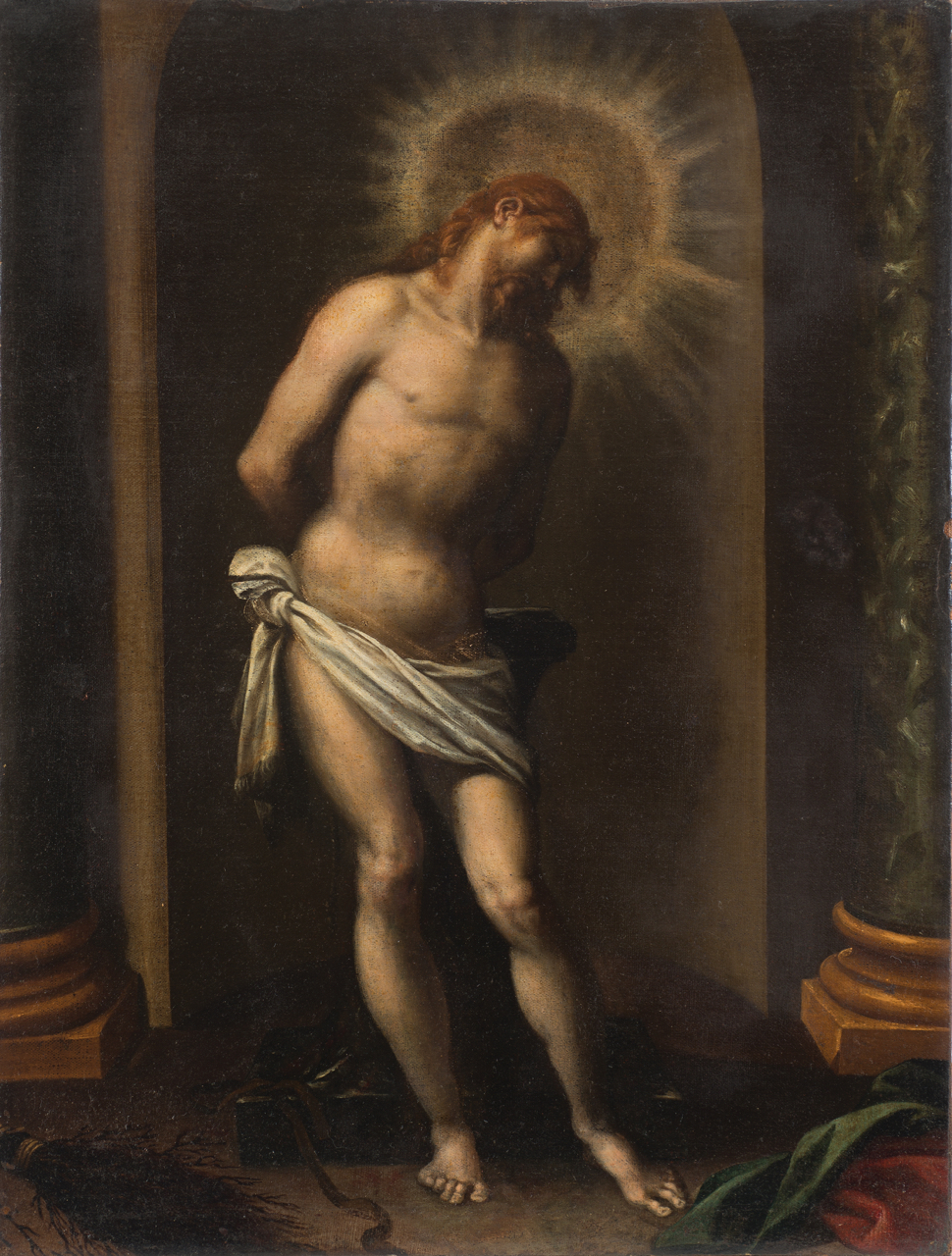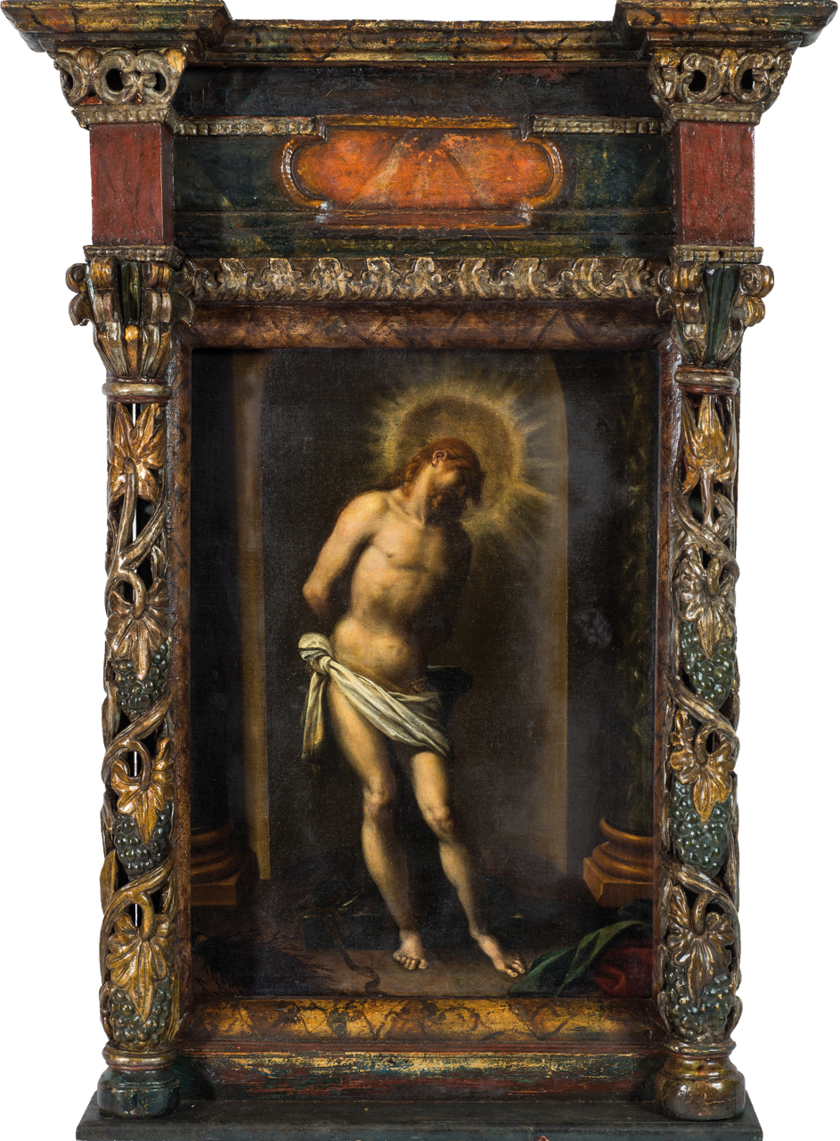 attribuito a Tiziano Vecellio (Pieve di Cadore, 1480/1485- Venezia, 1576) Cristo alla colonna olio su tela, cm 74,3x55 entro importante cornice-tabernacolo, probabilmente attribuita a Mombelli, adattata nelle misure e rimaneggiata Bibliografia: Lionello Puppi e Vincenzo Pacelli in "Per un inedito Cristo alla colonna" in Studi di Storia dell'Arte, n.24, 2013, pp 5-31 foto Il dipinto viene offerto con due comunicazioni scritte ai proprietari dei proff. Vincenzo Pacelli e Lionello Puppi, datate agosto 2012 e aprile 2013. Entrambi gli studiosi confermano l'attribuzione del dipinto al grande maestro veneto, esperimendo la convinzione che si tratti di un capolavoro databile agli anni Sessanta del Cinquescento, ossia alla sua stagione estrema. Nella pubblicazione citata, in seguito ad approfondite indagini diagnostiche e ricerche bibliografiche, si ipotizza che il dipinto possa essere identificato con il "Christo battuto" commissionato a Tiziano da Torquato Bembo (figlio del grande umanista Pietro) con il documento del 18 febbraio 1574, rinvenuto e pubblicato dal professor Puppi.
