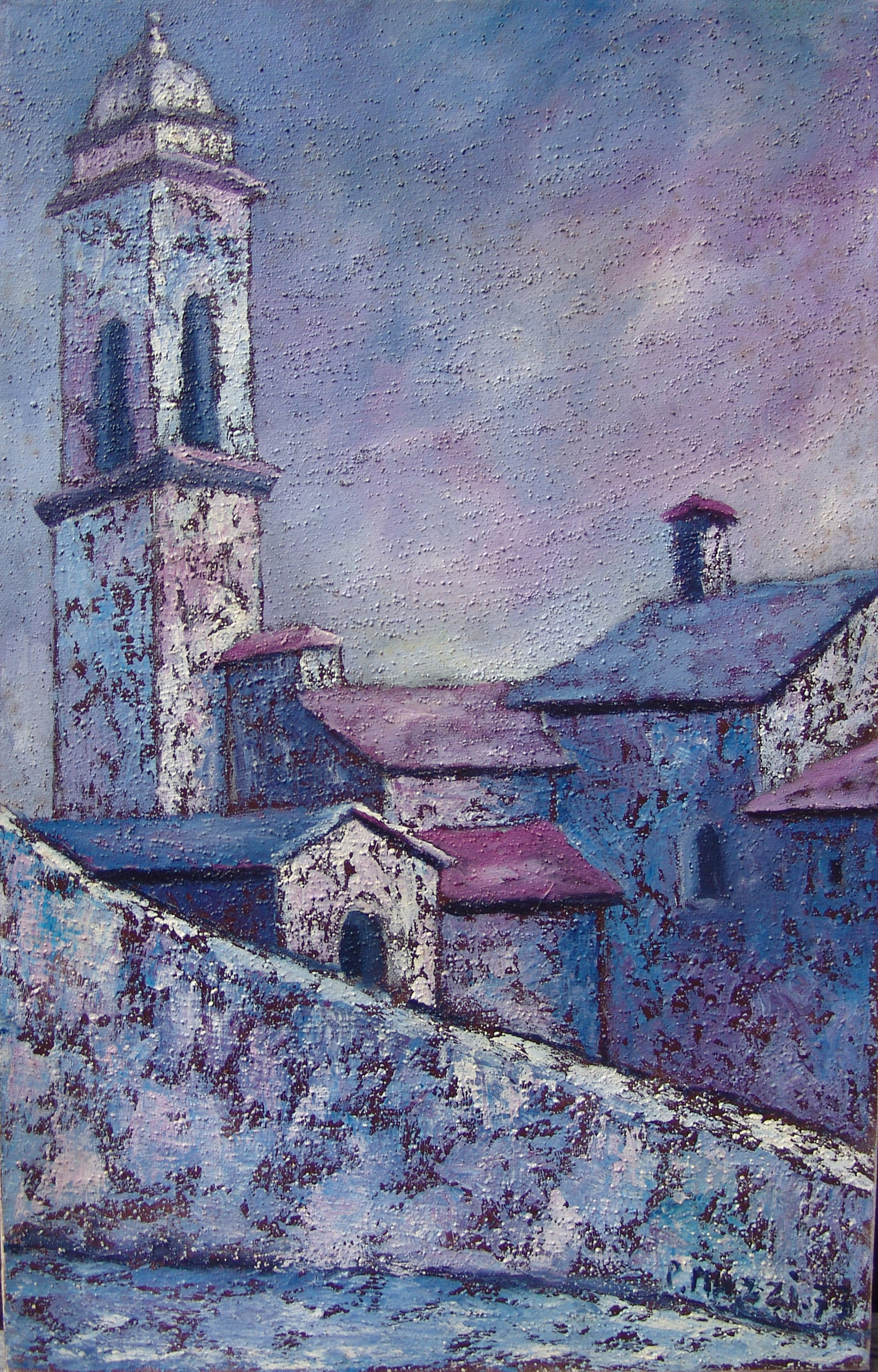 Piero Mazzi "Case blu" 2003 tecnica mista su tela cm 60x40 Prov. Galleria Accademia-To