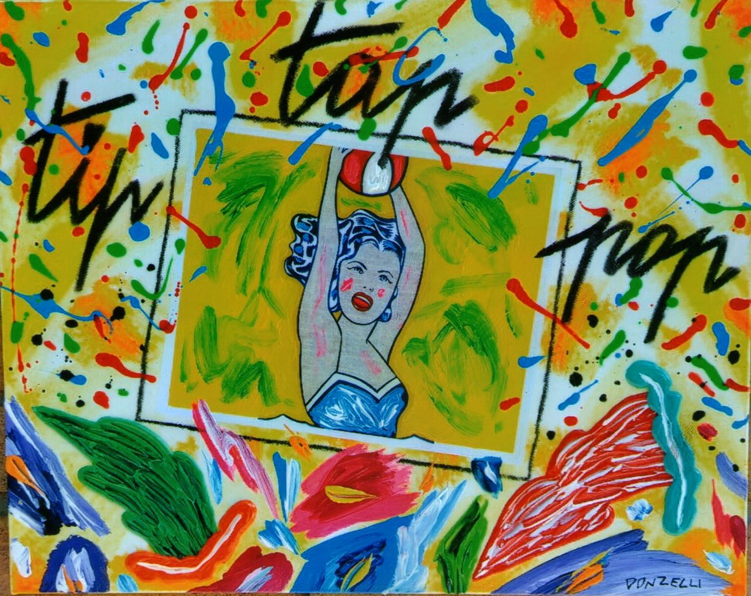 Bruno Donzelli "Tip, tap, pop" olio, acrilici e smalti su tela cm 40x50 Firma in basso a destra con autentica su foto dell'Artista