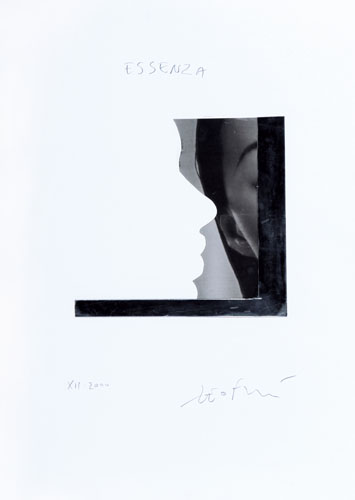 EMILIO LEOFREDDI 1958 Essenza, 2000 collage su carta cm. 70x50, firma in basso a destra, anno in basso a sinistra, titolo in alto al centro, dichiarazione d'autenticità dell'artista su stampa fotografica, entro teca in plexiglass