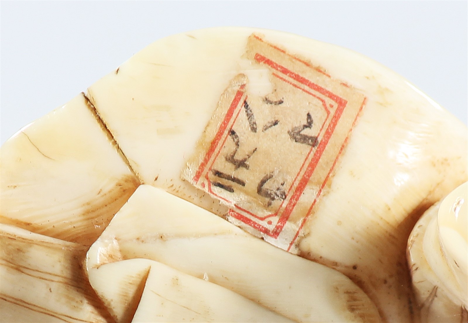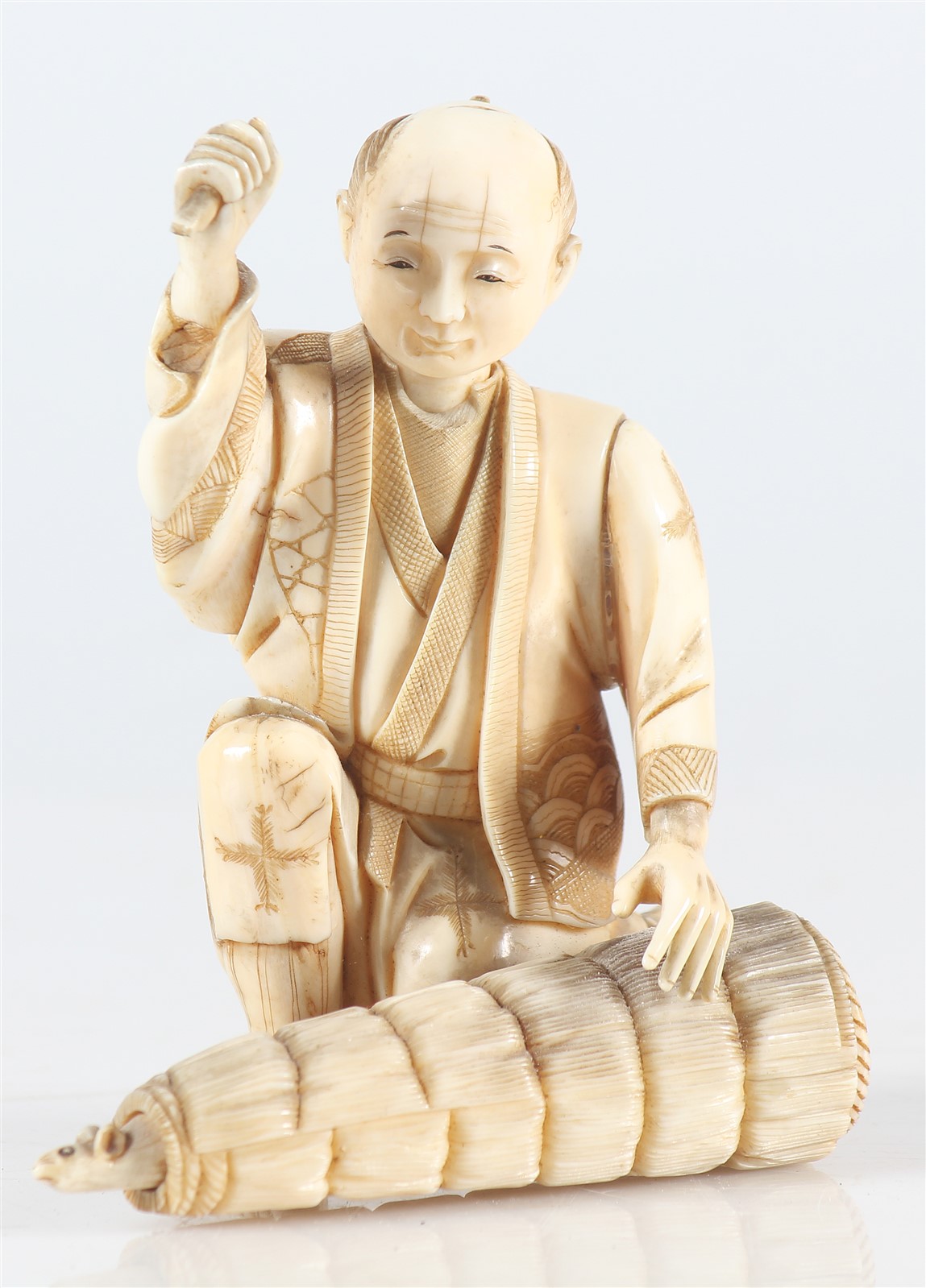 MANIFATTURA GIAPPONESE DEL XIX SECOLO Contadino con contenitore e topolino. Avorio. Cm 11,00.