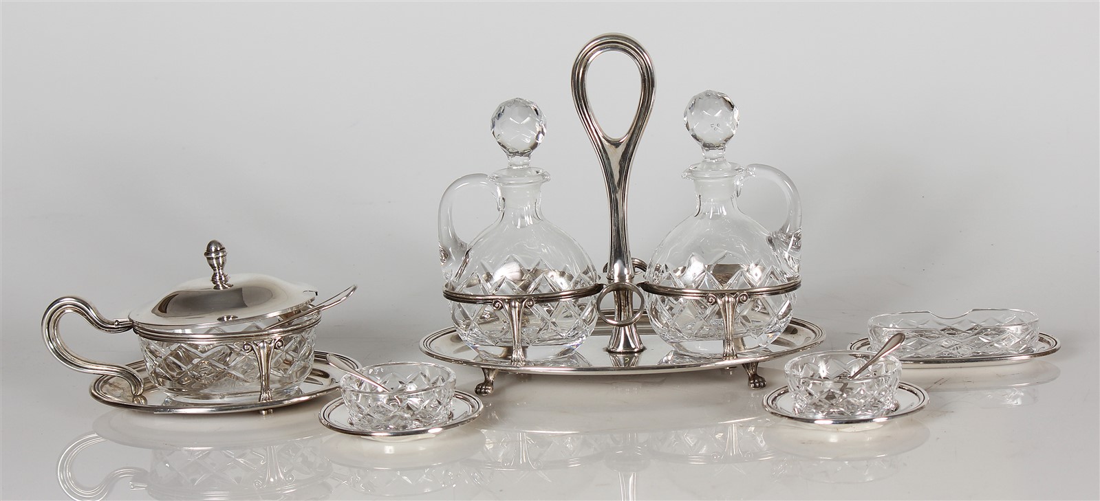 MANIFATTURA DEL XX SECOLO Servizio in argento. Argento. . Servizio composto da oliera 23x19x11; formaggera cm 8x19x11 cm, due salire cm diametro 8; un porta stuzzicadenti cm 12x7.