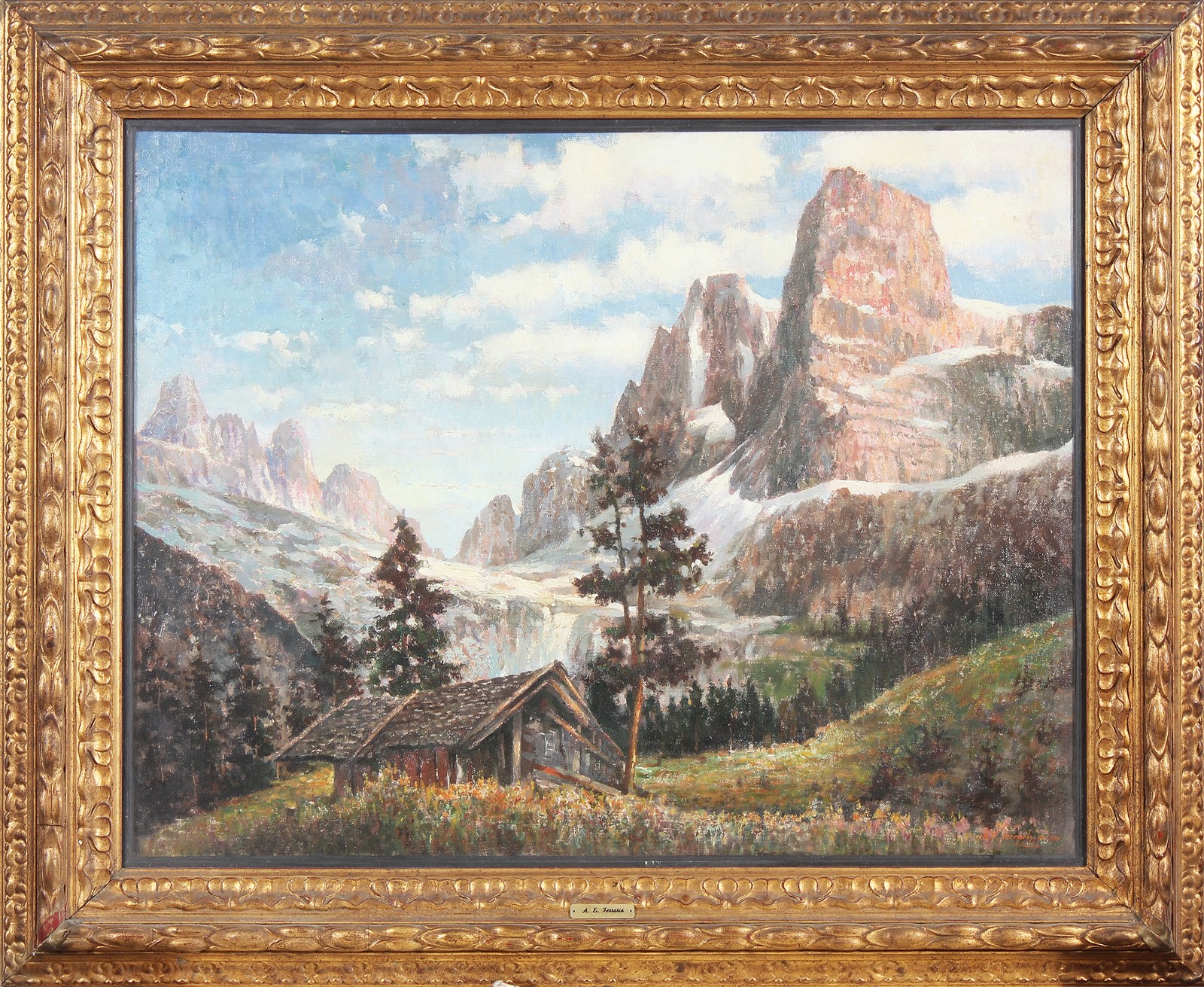 FERRARIS A. E. Paesaggio montano. 1938. Olio su tela . Cm 76,00 x 100,00. Firma e anno in basso a destra. Cornice presente