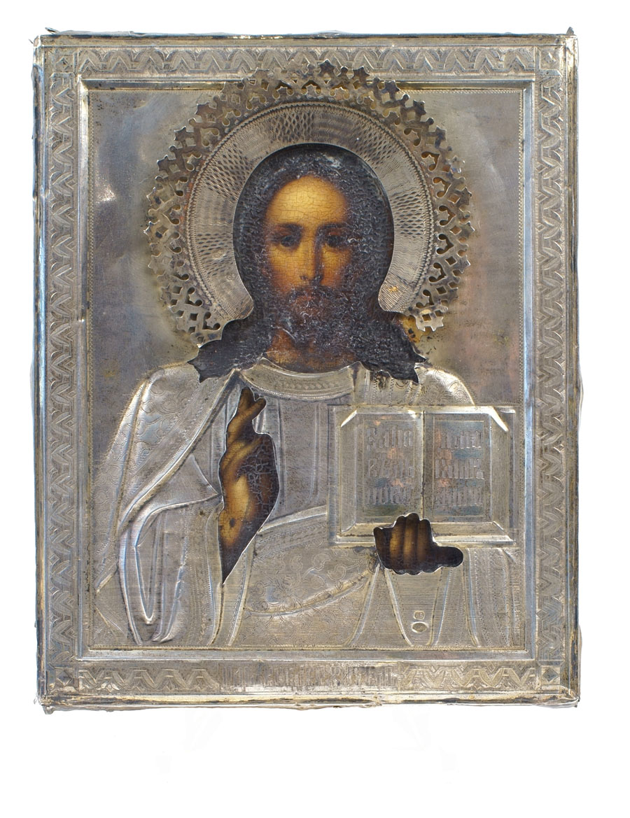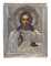 ICONA CON RIZA IN ARGENTO Mosca, 1908-1917 tempera su tavola raffigurante "Cristo", restauri A RUSSIAN SILVER ICON WITH SILVER RIZA Moscow, 1908 - 1917 Restorations 18x14,5 cm.
