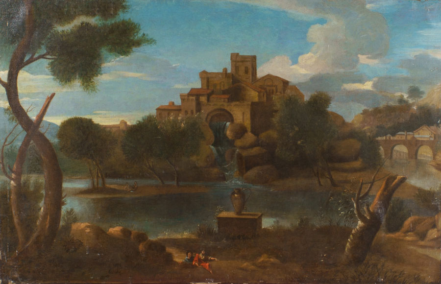 SEBASTIAN BOURDON, SEGUACE DI Francia, XVIII Sec. "Paesaggio fluviale con personaggi", olio su tela, entro cornice FOLLOWER OF SEBASTIAN BOURDON France, 17th century "Landscape with castle", oil on canvas 118x76 cm.