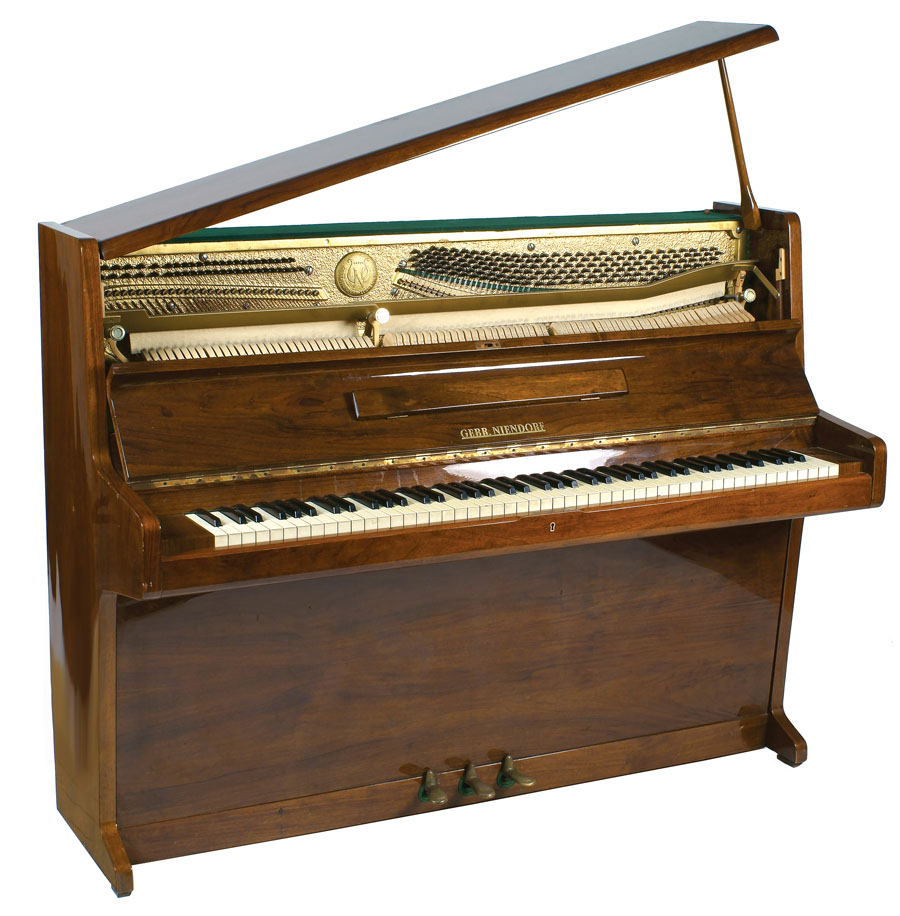 PIANOFORTE VERTICALE GEBR. NIENDORF Germania, anni 70/80 cassa in noce, tastiera in avorio, accordato A GEBR. NIENDORF PIANOFORTE Germany, 1970/80s Walnut resonating body, ivory keyboard, in tune 113x146x58 cm.
