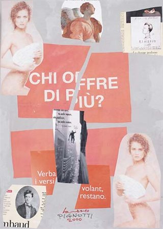 LAMBERTO PIGNOTTI Firenze 1926 Chi offre di più, 2000 collage su cartone cm. 70x50, firma e anno in basso al centro, titolo, firma e anno al retro