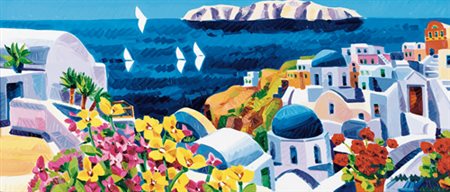 ATHOS FACCINCANI Peschiera (Vr) 29/01/1951 Luce e profumi di Santorini olio su tela cm. 30x70, firma in basso a destra, dichiarazione d'autenticità dell'artista e timbro della Ardea (Monzambano-MN) su foto