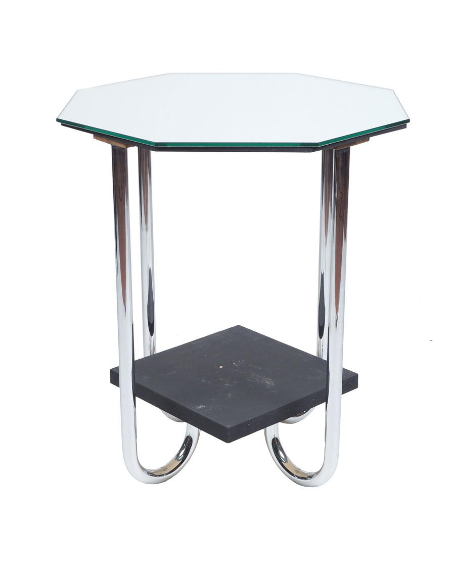 PARTICOLARE TAVOLINO VINTAGE anni 70 struttura in acciaio lucido, piano ottagonale a specchio con un ulteriore ripiano in legno ebanizzato A STEEL DESIGN TABLE 1970s Steel structure with ebonized wood 62x54x54 cm.