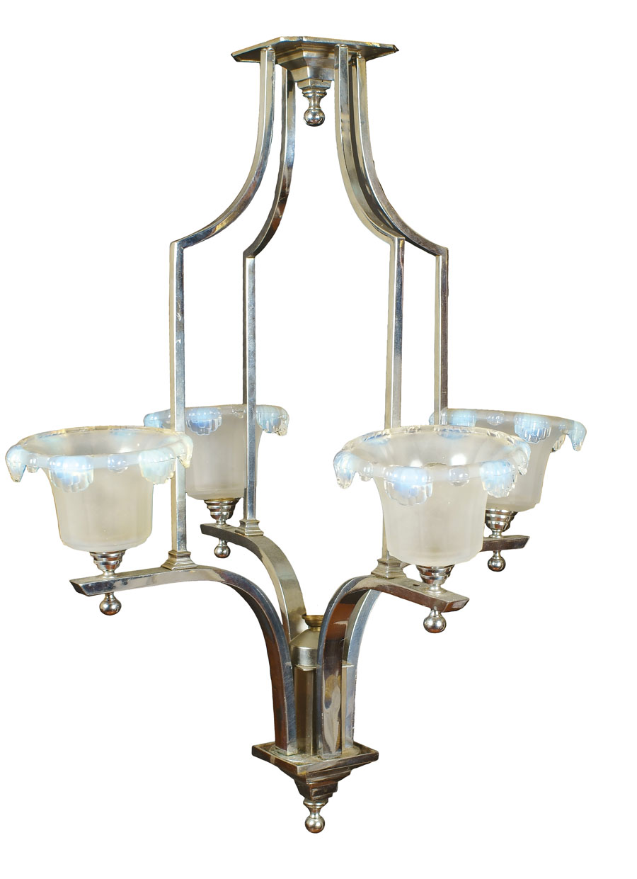 LAMPADARIO DECò A QUATTRO LUCI Francia, XX Sec. struttura in metallo argentato, coppe paralume in vetro satinato A FRENCH FOUR-BRANCH DECO' LAMP 20th century Satined glass lampshades with silvered metal structure 80x60 cm.