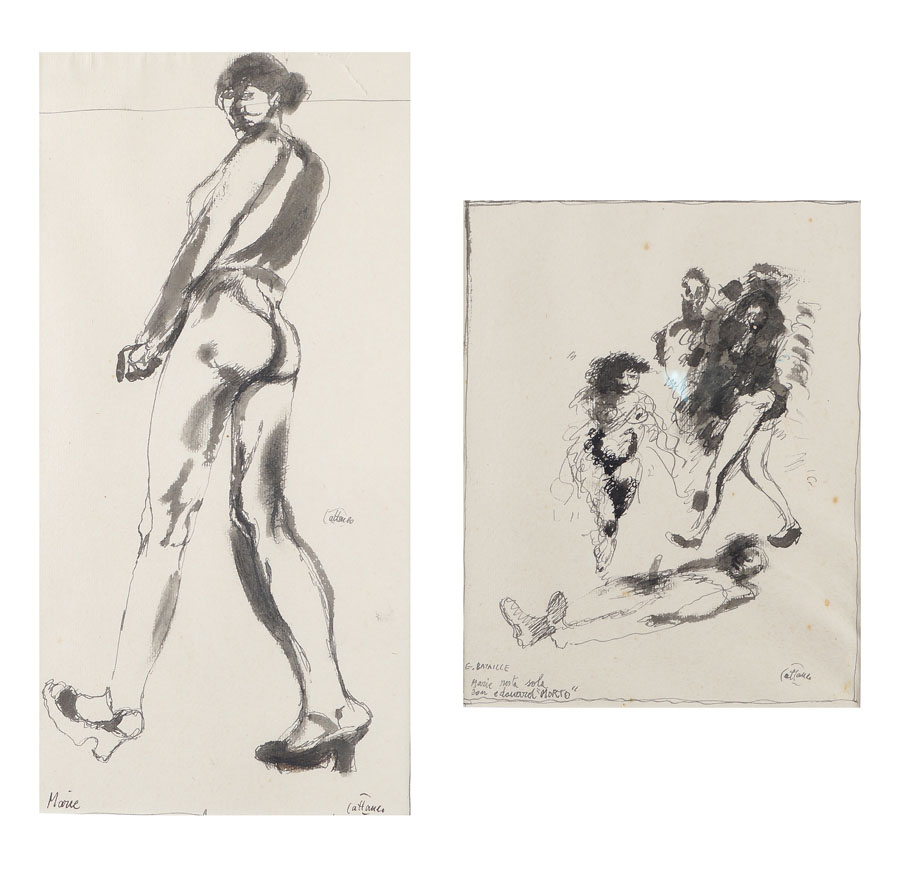 CARLO CATTANEO Alassio 1905- Roma 2009 coppia di tecniche miste su carta raffiguranti scene tratte dal romanzo erotico "Le mort" di G. Bataille, entro cornici CARLO CATTANEO Alassio 1905- Rome 2009 A pair of two mixed techniques on paper, with scenes of the novel "Le mort" of G. Bataille, framed misure diverse