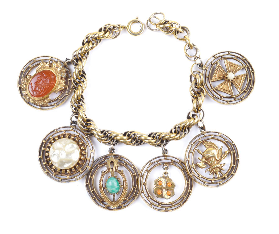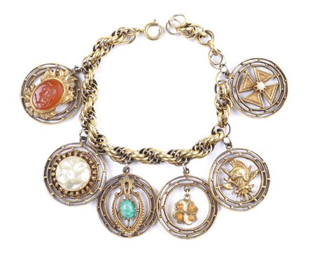 BRACCIALE CHARMS BIJOU VINTAGE in metallo dorato e pietre A BIJOU VINTAGE METAL-GILT CHARMS BRACELET With six different pendants l. 19 cm.