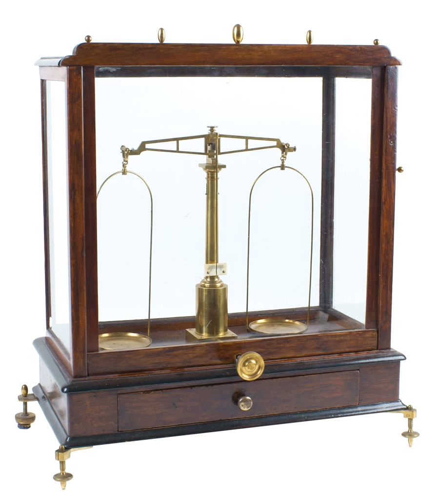 BILANCIA DA PRECISIONE ENTRO TECA IN MOGANO XX Sec. completa di pesi A PRECISION BALANCE WITH CASE 20th century with weights 50x49x26 cm.