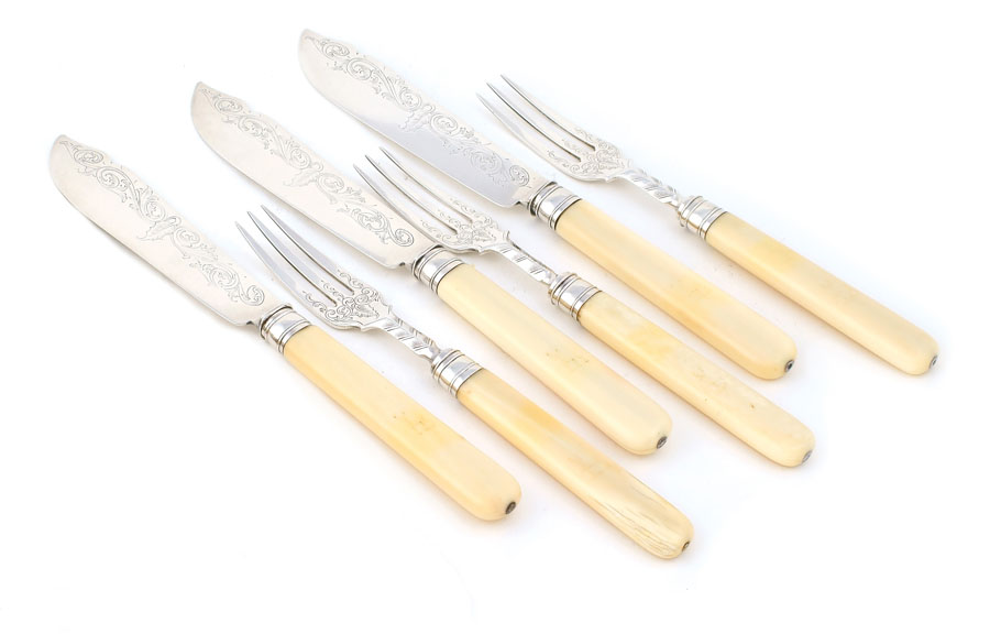 SERVIZIO DI 12 POSATE DA PESCE IN ARGENTO Londra, 1866 composto da 12 forchette e 12 coltelli sbalzati a motivi di volute, manici in avorio AN ENGLISH SILVER FISH FLATWARE SERVICE (24) London 1866 comprising 12 fork and 12 knives, ivory handels