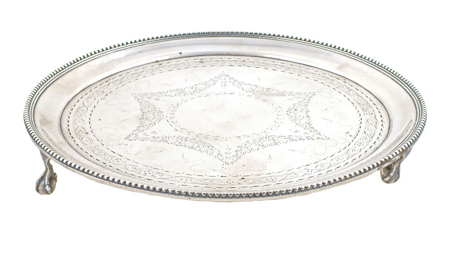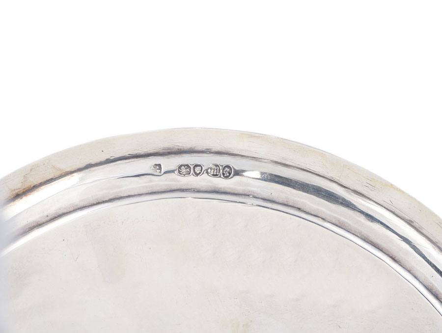 SALVER IN ARGENTO Londra, Regina Vittoria, 1867 profilo godronato, poggiante su tre piedini ad artiglio, d. cm. 20 A SILVER QUEEN VICTORIA SALTCELLAR London, 1867 Milled borders and on three claw-shaped legs peso 339 gr.