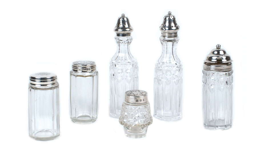 SEI FLACONI IN VETRO MOLATO CON TAPPI IN ARGENTO Inghilterra, inizio XX Sec....
