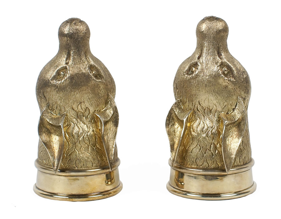COPPIA DI BICCHIERI DELLA STAFFA IN ARGENTO VERMEIL, COLLEZIONE BULGARI Londra, 1967 orafo argentiere Padgett & Braham, a forma di testa di volpe, h. cm. 16,5 A PAIR OF SILVER VERMEIL STIRRUP CUPS London 1967 Silversmith Padgett & Braham peso 842 gr.