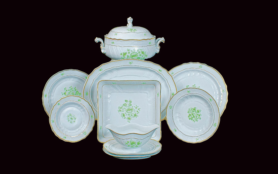 LOTTO RITIRATO Servizio di 57 piatti in porcellana Hollhaza decoro "Scarbantia verde" con profilo in oro, composto da 24 piatti piani, 15 fondi, 12 piatti frutta, 1 zuppiera, 1 insalatiera, 1 piatto ovale, 1 piatto tondo, 1 salsiera, 1 raviera CANCELLED LOT Hungary, 20th century gilt rims, 24 pieces comprising 15 soup plates, 12 dessert plates, 1 soup bowl, 1 salad bowl, 1 oval plate, 1 circular plate, 1 saucier, 1 plate for antipasti