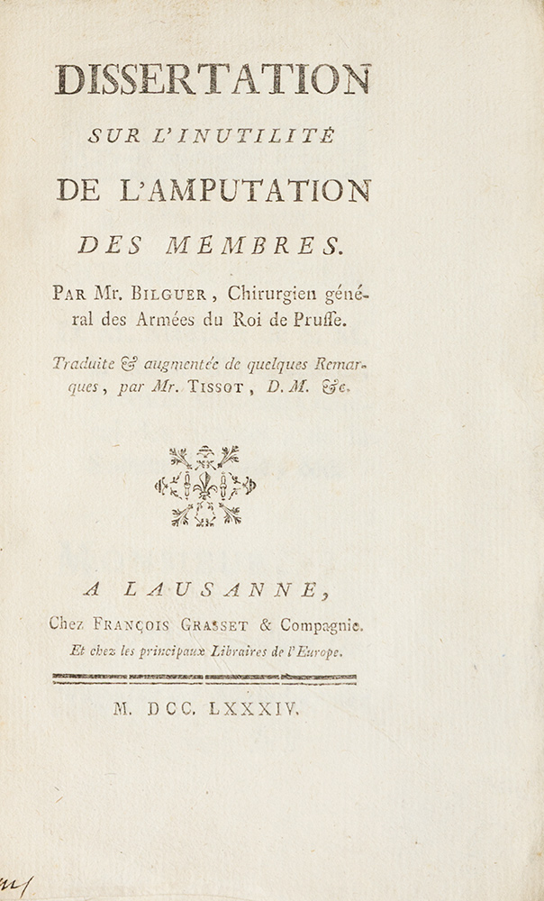 Chirurgia - Bilguer, Johann Ulrich - Tissot, Samuel-Auguste Dissertation sur l'inutilité de l'amputation des membres. Traduite et augmentée de quelques Remarques par Mr. Tissot Lausanne, Grasset, 1784. In 12°. Esemplare in barbe, legatura in cartonato coevo muto. Importante prima versione francese, con le inedite note di Tissot. Trattato di "chirurgia conservativa" in cui il medico prussiano, sulla base della sua lunga esperienza nel campo della chirurgia militare, si pronunzia nettamente contro la prassi corrente all'epoca di amputare arti e membra. In virtù delle molte note del celebre Tissot può essere considerata un'opera originale. Hirsch I, 535; Wellcome II, 167.