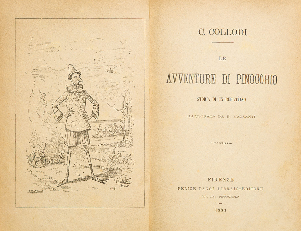Collodi, Carlo Le avventure di Pinocchio. Storia di un burattino Firenze, Felice Poggi Libraio-Editore, 1883. In 8°. Ritratto di Pinocchio in antiporta, 61 vignette di Enrico Mazzanti nel testo, consueta brunitura della carta, mancante il catalogo editoriale, legatura moderna in mezza pelle rossa, dorso a 4 nervi con autore e titolo in oro. EDIZIONE ORIGINALE del capolavoro di Carlo Lorenzini, con le belle illustrazioni di Enrico Mazzanti, pubblicato originariamente a puntate sulla rivista il Giornale per i bambini a partire dal 7 luglio 1881. Le Avventure comparvero sul giornale fino al cap. XV e furono poi portate a compimento nel presente volume pubblicato da Poggi nel 1883.