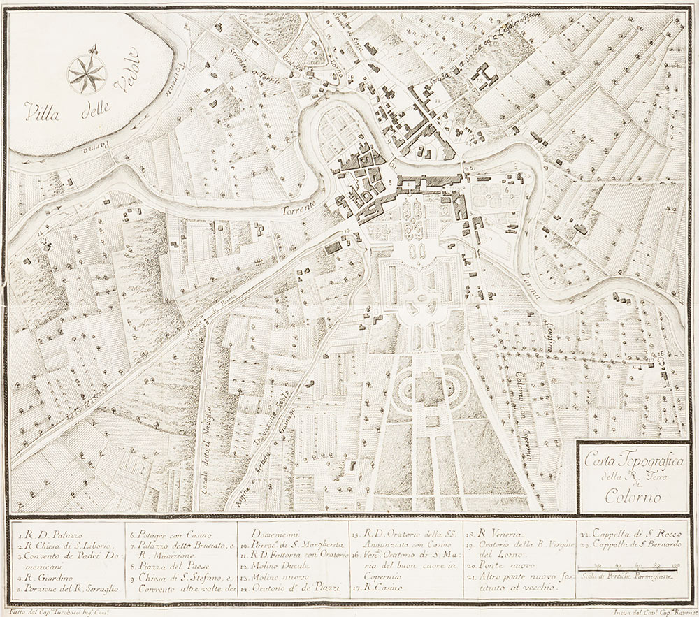Colorno Diario di Colorno per l'anno M. DCC. XCVII Parma, Dalla Stamperia Reale, 1797. In 8°. Tavola ripiegata incisa in rame f.t. con carta topografica di Colorno e circondario, legatura coeva in piena pergamena, titolo in oro su tassello in pelle al dorso, tagli in rosso. Rarissima edizione originale. L'opera fu voluta dal Duca Ferdinando di Borbone, educato da Condillac e animato da un sincero interesse per la cultura, che elesse Colorno a sua residenza prediletta occupando gli appartamenti della Reggia. Il diario contiene una grande quantità di informazioni utili per gli abitanti di Colorno. La bella carta topografica è incisa in rame da Ravenet su disegno dell'ingegnere Iacobacci.