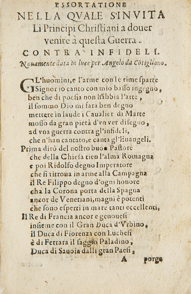 Cotigliano, Angelo da Essortazione nella quale s'invita Li principi Christiani a dover venire à questa Guerra contra infedeli. Novamente data in luce per Angelo da Cotigliano Perugia, Pietropaolo Orlando, 1597. In 8°. Qualche piccola macchia, legatura del sec. XVIII in carta policroma. Edizione rara.