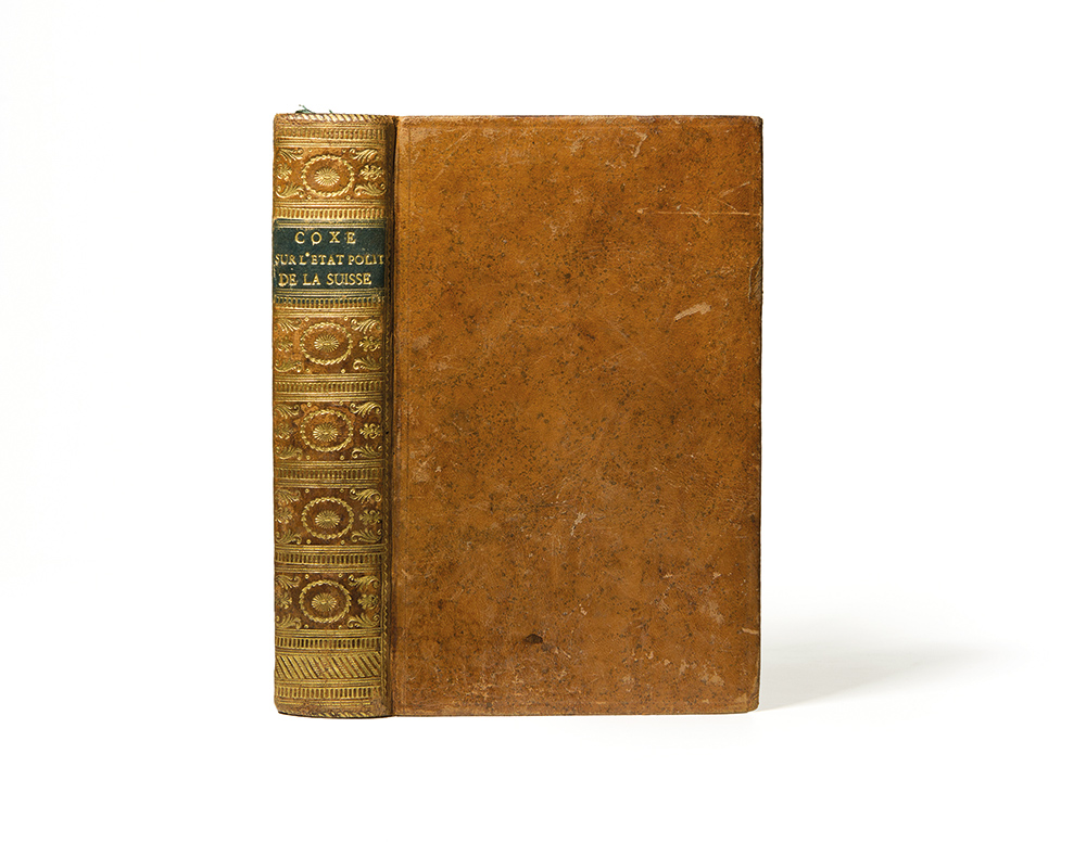 Coxe, William Lettres de M.William Coxe a M.W. Melmoth Parigi, Belin, 1782. In 8°. Due parti in un vol. Vignetta calcografica al frontespizio, legatura coeva in vitello spugnato, dorso con decorazioni in oro e titolo su tassello verde, tagli a spruzzo.