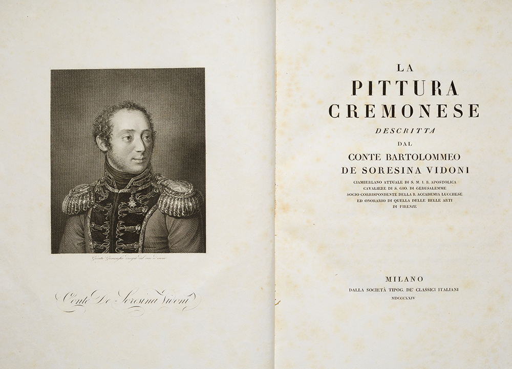 Cremona - Soresina Vidona, Bartolomeo de La pittura cremonese descritta Milano, dalla Societa Tipog. De' Classici Italiani, 1824. In 2°. Antiporta con ritratto inciso da Giovita Garavaglia e 26 tavole fuori testo incise in rame da A. Gravagni, G. Ceresa, L. Miazzi, C. Ferreri, ognuna protetta da velina, fioriture sparse, legatura coeva in mezzo marocchino, al dorso fregio e titolo in oro, qualche spellatura. Prima edizione ed unica di questa importante opera sulla storia della pittura di Cremona in cui l'autore fornisce notizie di circa cento pittori cremonesi, anche minori, prevalentemente di epoca rinascimentale. Brunet V, 1183; Lozzi I, 1414 (nota).