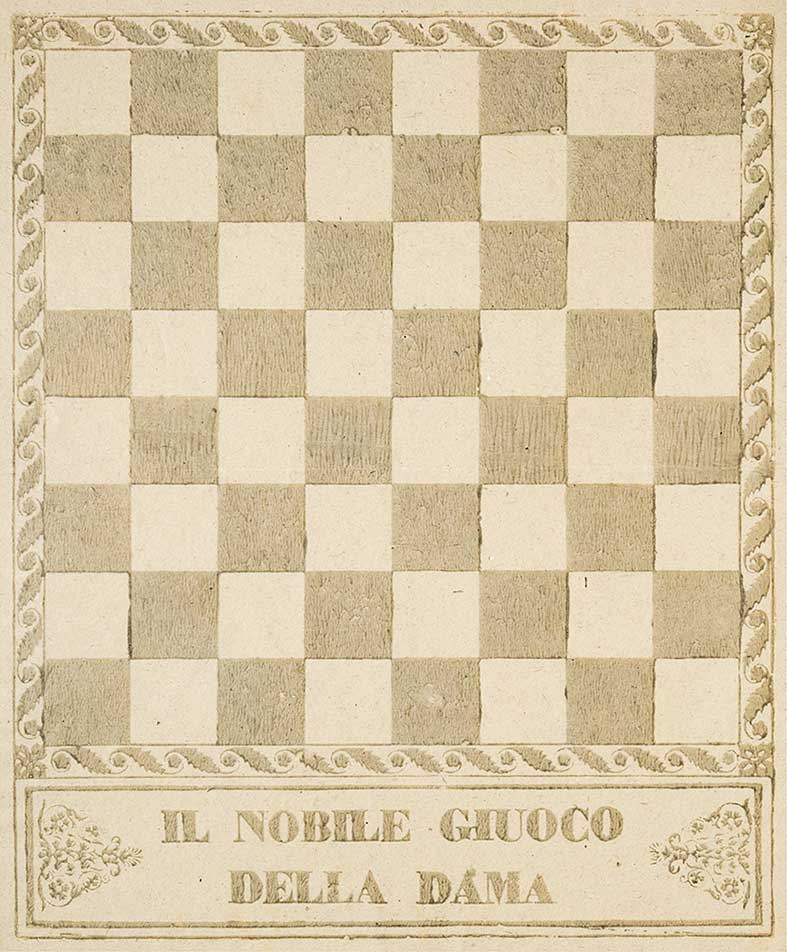 Dama Il nobile giuoco della Dama Xilografia in coloritura coeva, Bassano, Remondini, fine del sec. XVIII, mm. 440 x 350 il foglio. Raro foglio con impressione ad una sola matrice in colore grigio verde. La scacchiera è entro una cornice ornata, in basso il titolo con fregi laterali.
