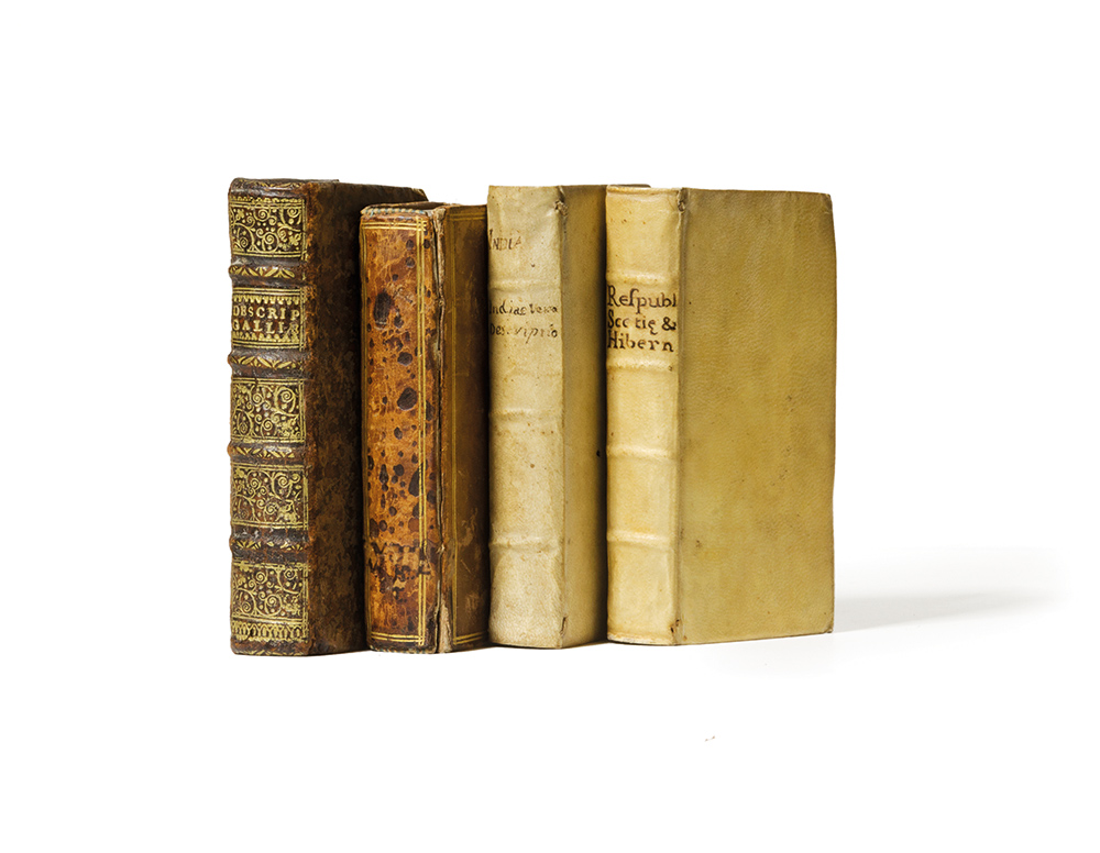 Elzeviri Respublica, sive status regni Scotiae et Hiberniae Leida, Ex officina Elzeviriana, 1627 [in fine 1630]. In 16°. Frontespizio figurato in rame, legatura coeva in piena pergamena. § Montalbano, Giovanni Battista. Turcici imperii status. Seu discursus varij de rebus Turcarum. Leida, Ex officina Elzeviriana, 1630. In 16°. Frontespizio figurato in rame, legatura coeva in piena pergamena. § Laet, Joannes De. Gallia, sive de Francorum regis dominus et opibus commentarius. Leida, Elzevier, 1629. In 24°. Frontespizio figurato in rame con monogramma PS, legatura in vitello spugnato con decorazioni in oro al dorso. § Laet, Joannes De. De Imperio Magni Mogolis, sive, India vera. Leida, Ex officina Elzeviriana, 1631. In 16°. Frontespizio figurato inciso in rame da Duysend, una tavola xilografica a p.p. con soggetto botanico, legatura coeva in pergamena rigida. Bell’insieme di 4 edizioni elzeviriane, alcune in prima edizione.