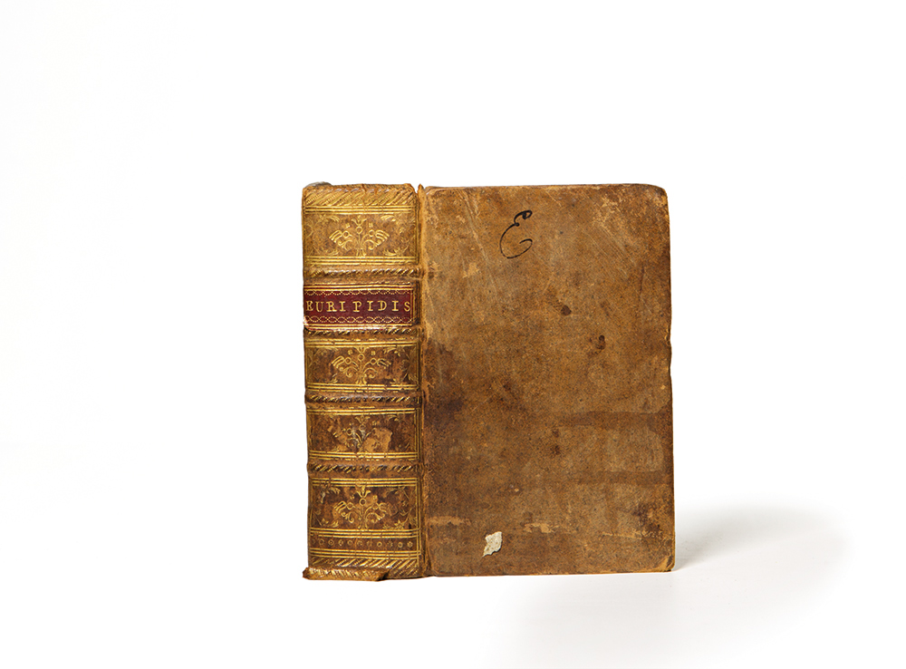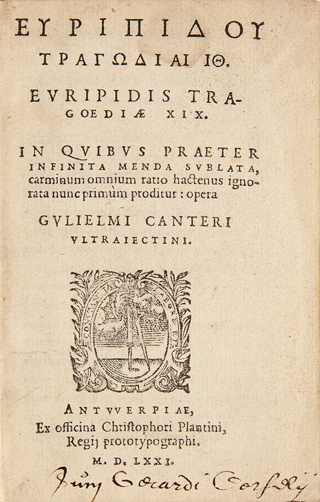 Euripide Tragoediae XIX Anversa, Christopher Plantin, 1571. In 16°. Marca tipografica al frontespizio, legatura in vitello spugnato del sec.XVIII. Nota di possesso manoscritta al frontespizio. Prima edizione Plantin e prima edita dallo studioso olandese Willem Canter (1542-75). “Canter’s edition dramatically influenced the course of Euripidean criticism in that he was the first to distinguish and mark the metrical responsions of the choruses, which had been printed in haphazard fashion in all previous editions” E. K. Schreiber, Catalogue 37, item 63.