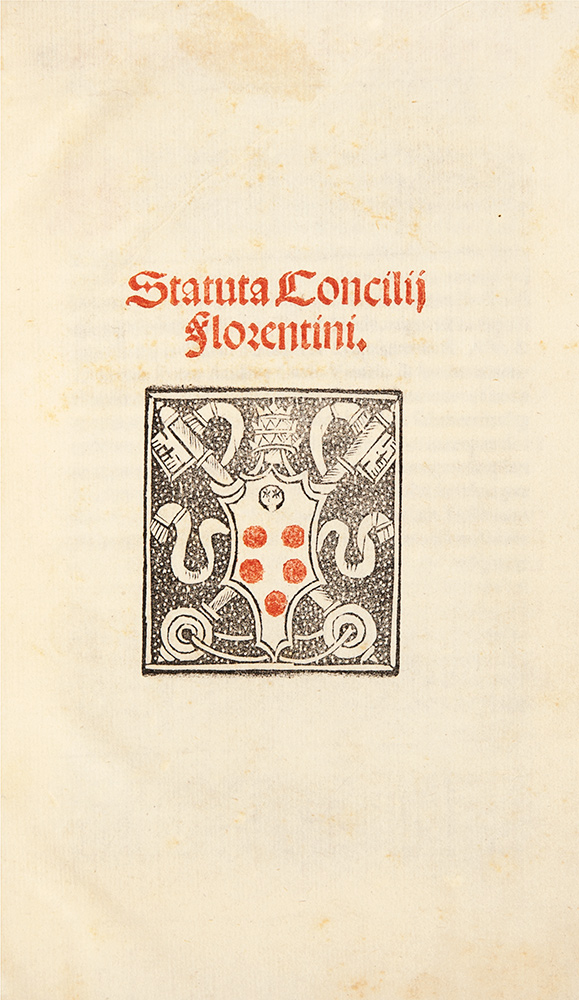 Firenze - Statuti conciliari Statuta Concilii Florentini Firenze, eredi Filippo Giunta, 1518. In 4°. Stampato in rosso e nero, stemma xilografico di papa Leone X sul frontespizio, legatura del sec.XIX in vitello marrone con decorazioni in oro ai piatti. Ex libris Thos.Gaisford al contropiatto. Bell’esemplare di un’edizione elegante e pregevole, appartenuta a Thomas Gaisford (22 dicembre 1779 – 2 giugno 1855) celebre studioso inglese di antichità classiche e curator della Bodleian Library.