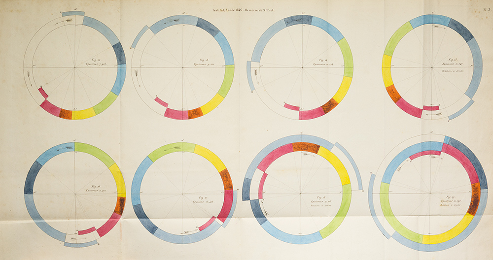 Fisica della luce - Biot, Jean-Baptiste Mémoire sur les phénomènes rotatoires opérés dans le cristal de Roche Paris, F. Didot, 1846. In 4°. Numerose tabelle nel testo e fuori testo, alcune ripiegate, tre tavole fuori testo incise e colorate più volte ripiegate, fioriture e bruniture, legatura coeva in cartone marmorizzato. Rara prima edizione. Importante opera in cui lo studioso francese, che aveva collaborato con Laplace, sviluppa gli studi sulla polarizzazione della luce. DSB: "In 1832 Biot recorded the property of a solution of tartaric acis of rotating polarized light, and he remarked on the anomalous dispersion it gave, the rotation begin greater for "les refrangible rays". In 1836 he presented to the Academy a memoir devoted entirily to the study of the rotatory power of tartaric acid under different conditions. He stressed that tartaric acid constituted an outstanding exception to his law of inverse squares (of wavelength). Biot accordingly divided optically active substances into two classes, those that obeyed his law and those that did not. He observed the crystalline forms of some salts of tartaric acid, but is was left to Pasteur to show the relationship between the crystalline form and the effect on polarized light. Biot was, significantly, an ardent champion of Pasteur at the beginning of his career." L'opera fu pubblicata a sè stante come estratto da: Mémoires Académie des Sciences, Tome XX. Poggendorff, I, col. 198; Gliozzi, St. Fisica, p. 209-11; Gillispie, I, pp. 136-40; DSB II, p. 139.