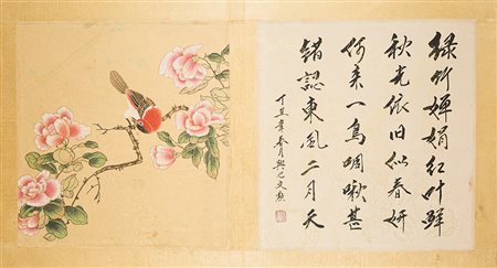 Giappone Album di fiori Album dellla fine del sec. XIX, inizi sec.XX, composto di 16 tavole incollate su supporto che si apre a fisarmonica, di cui 8 acquerelli su carta seta raffiguranti fiori e a fronte tavola di testo stampata su carta seta di colori diversi con elementi decorativi in oro, bruniture e qualche macchia, piatti dell'album in seta, qualche macchia.