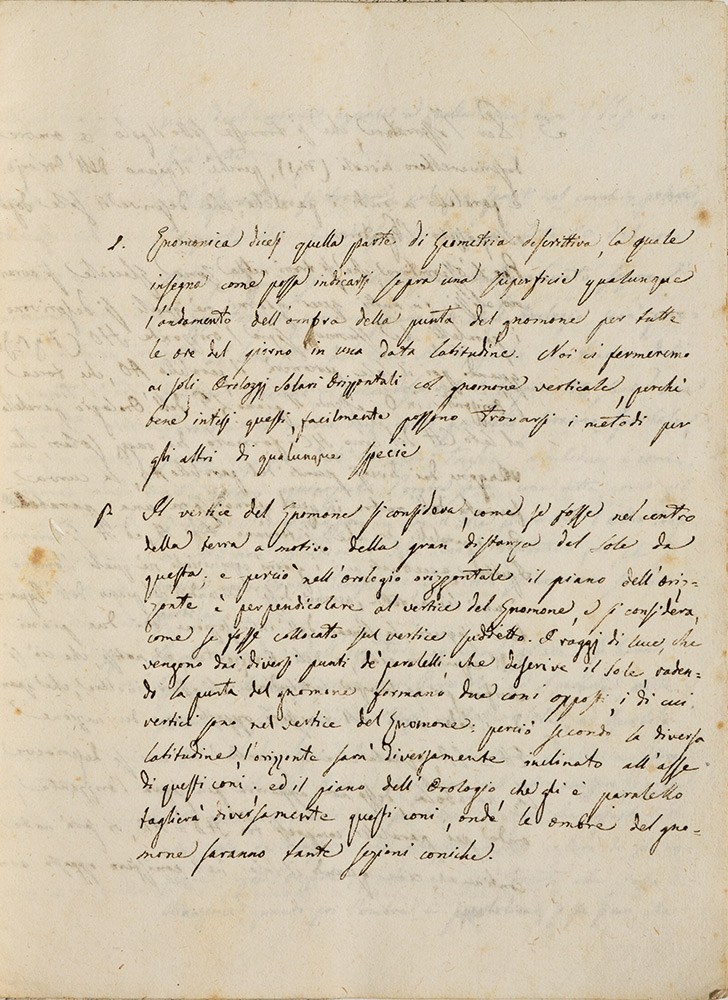Gnomonica - Manoscritto Gnomonica Manoscritto cartaceo, XVIII secolo, 254x190 mm. Leg. coeva in cartonato; cc. 10 nn., nitida scrittura corsiva, inchiostro seppia. Trattato manoscritto di gnomonica articolato in 15 capitoli. L'opera è finalizzata alla creazione di orologi solari orizzontali, con particolare riferimento a quelli italiani. Nei primi capitoli l'autore fornisce le basi teoriche della gnomonica, poi indica passo per passo la procedura che bisogna seguire per costruire un orologio solare, spiegando anche i differenti metodi che possono essere applicati per tracciare la meridiana e le linee orarie. I capitoli 12 e 13 espongono due diverse maniere per disegnare le ore italiane sulla meridiana; l'ultimo capitolo riguarda la differenza della ripartizione del tempo presso gli antichi e presso i moderni.