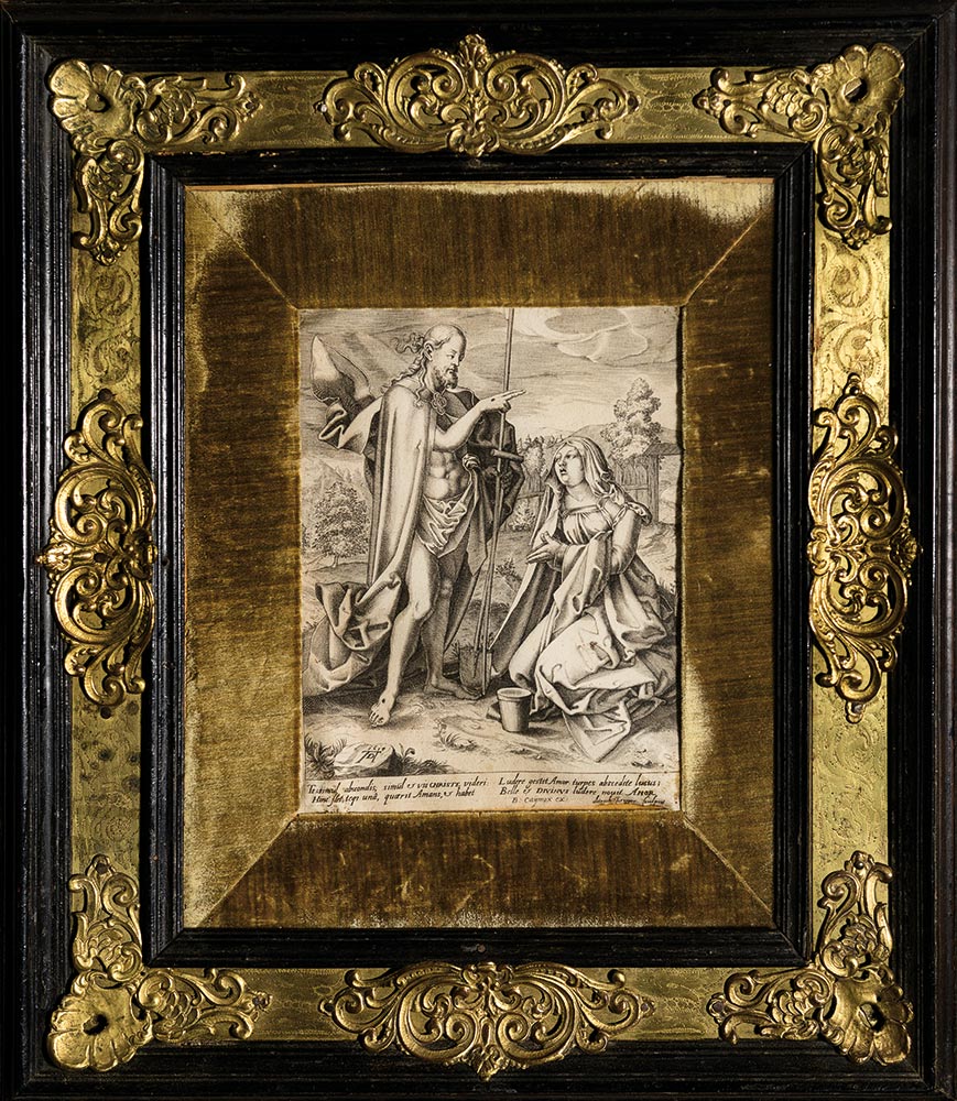 Kruger, Ditrich [Cristo e la Maddalena] Bulino, Caymox [1514], sopra una pietra a sinistra la marca “AD” sormontata dalla data 1514, firmata in lastra in basso a destra, in calce versi in latino, piccole macchie al margine inferiore, mm. 210 x 160, passepartout in velluto, cornice in legno nero e metallo dorato con festoni a rilievo, piccoli difetti. Foglio raro con la Maddalena in ginocchio e le mani giunte e Gesù in piedi che la benedice con la destra e nella sinistra tiene lo stendardo e la vanga.