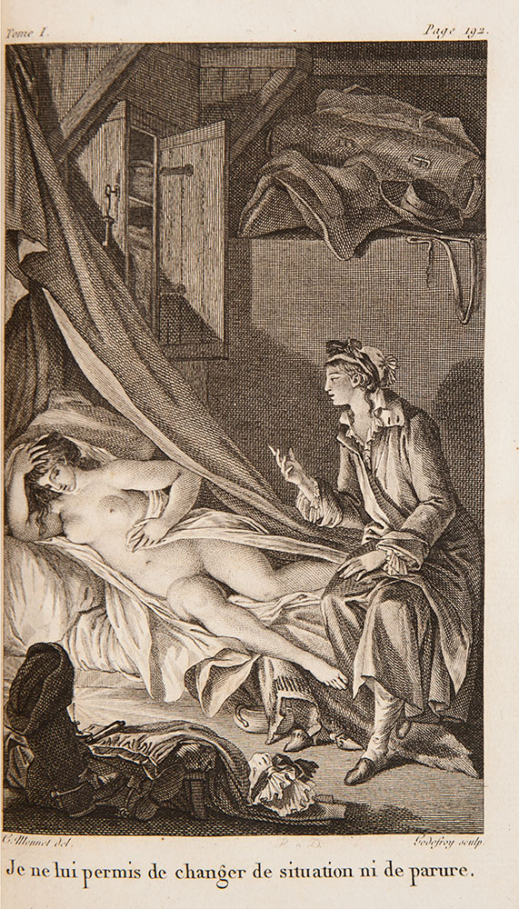 Laclos, Pierre Choderlos de Les Liaisons dangereuses. Lettres recueillies dans une societe, et publiees pour l'instruction de quelques autres Londra, s.e., 1796 [ma Parigi 1812. In 8°. 2 voll. Due antiporte e 13 tavole incise finemente in rame fuori testo da Bacquoy, Duplessi-Bertaux, Godefroy, Langlois, Lemire, Lingee, Masquelier, Patas, Pauquet, Du Preel ed altri sui disegni di Monnet, i figli di Fragonard, qualche arrossatura sparsa, legatura coeva in vitello marmorizzato, al dorso liscio tasselli in pelle rossa e nera con titolo e seminato di motivi geometrici impressi in oro, spellature. Edizione probabilmente pubblicata verso il 1812, si discute se si tratti di contraffazione o reimpressione dell’edizione illustrata del 1796 del celebre romanzo epistolare del Laclos, capolavoro della letteratura francese del sec. XVIII, opera libertina per antonomasia. Cohen - De Ricci 235-236.